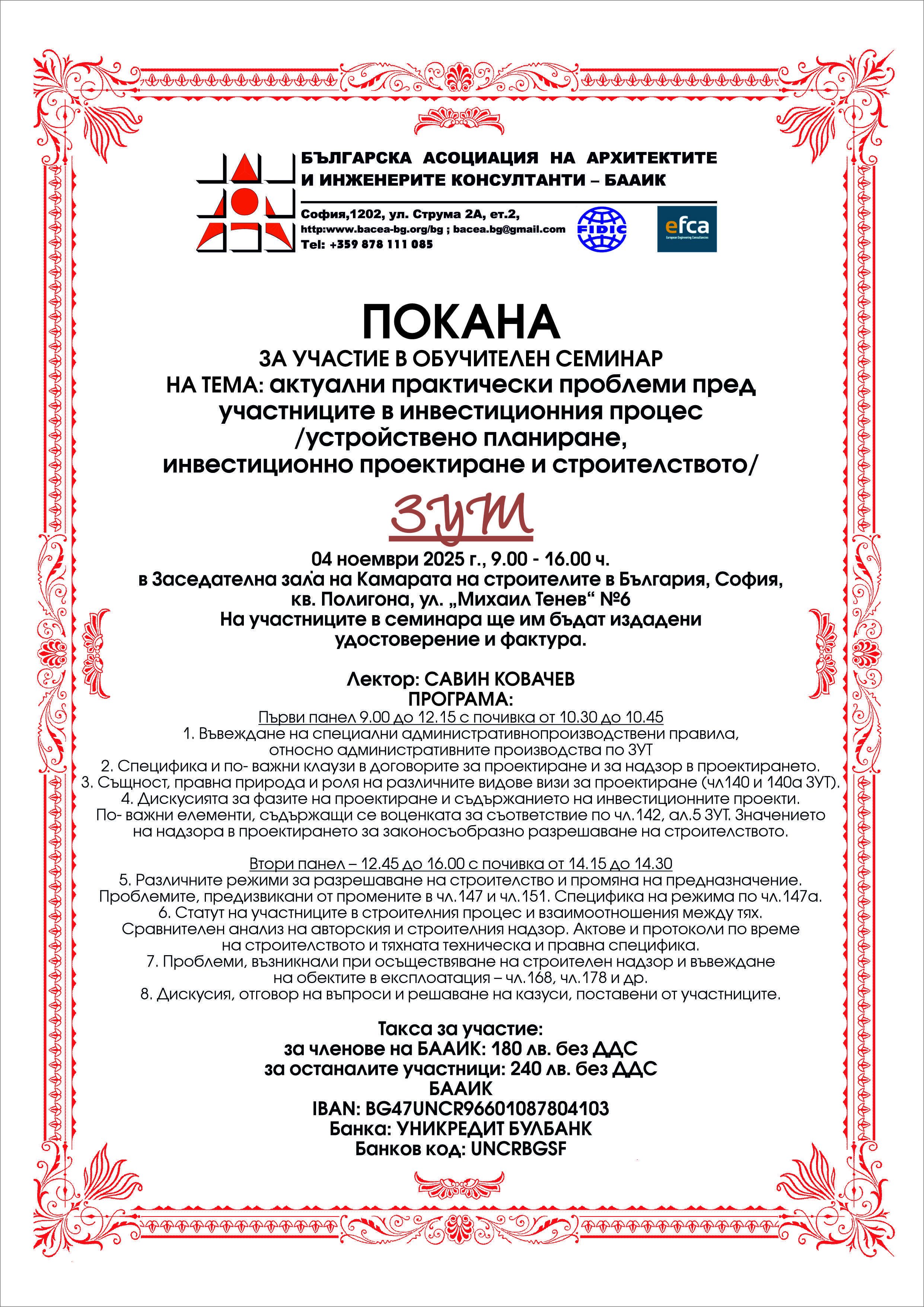 Обучителен семинар на тема: Актуални практически проблеми пред участниците в инвестиционния процес , 04.11.2025 г., в КСБ