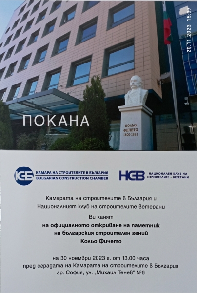 Камарата на строителите в България (КСБ) и Националният клуб на строителите ветерани Ви канят на официалното откриване на паметник на Кольо Фичето.